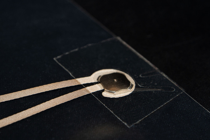 Als Träger für die Leiterbahnen kam ein Stück Folie zum Einsatz. Die Leiterbahnen kamen im Siebdruckverfahren mit leitender Farbe darauf.